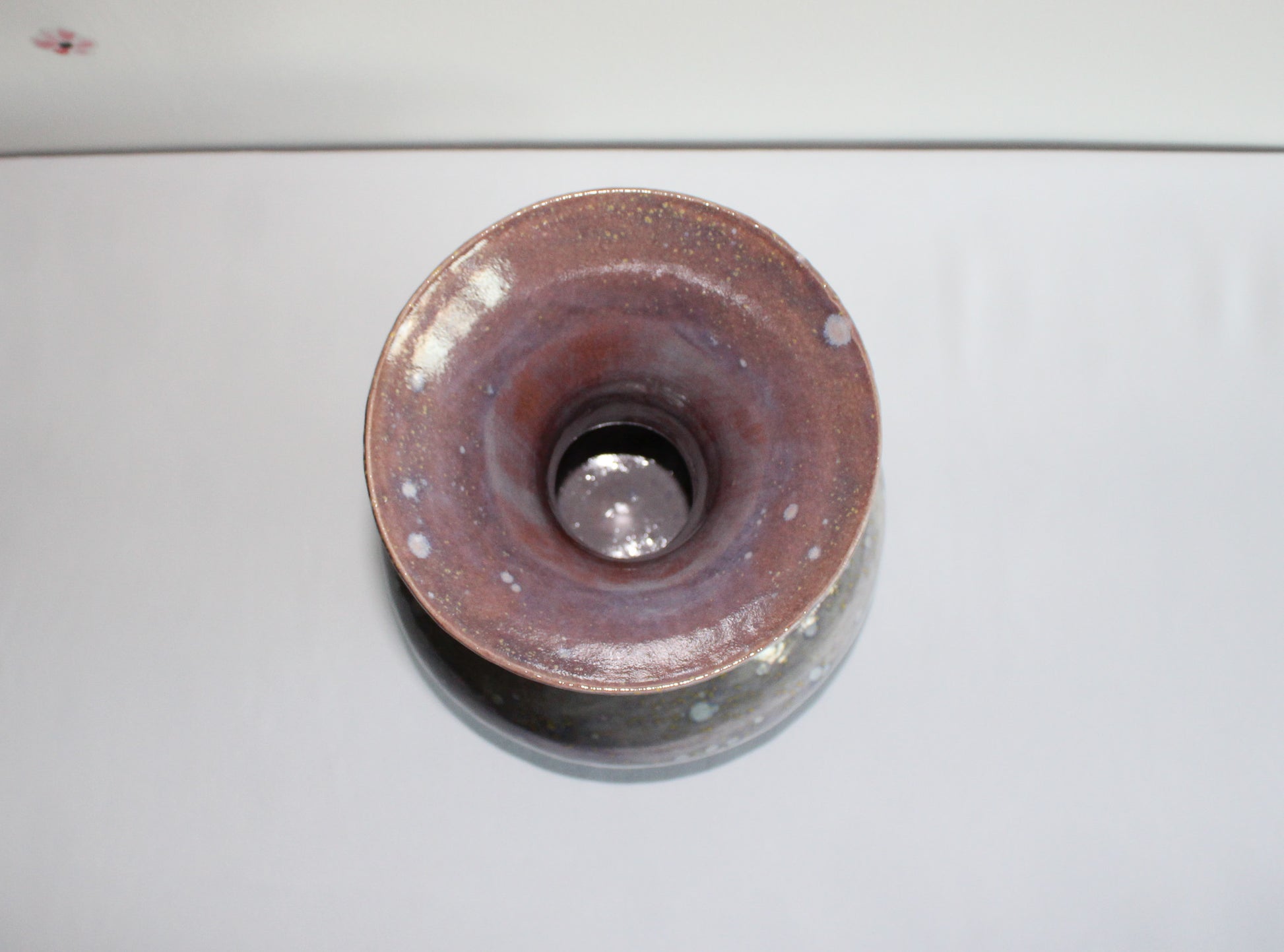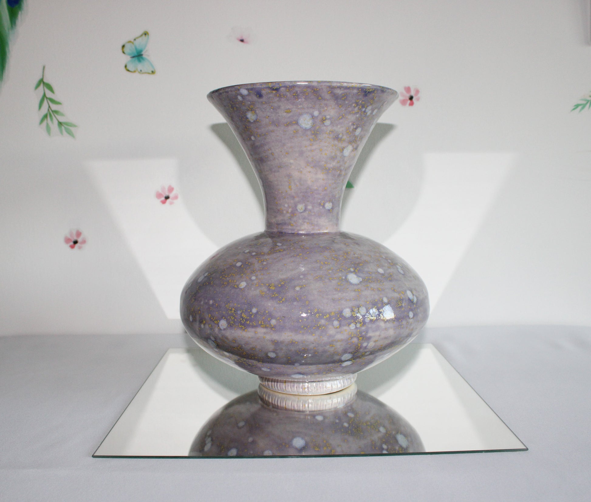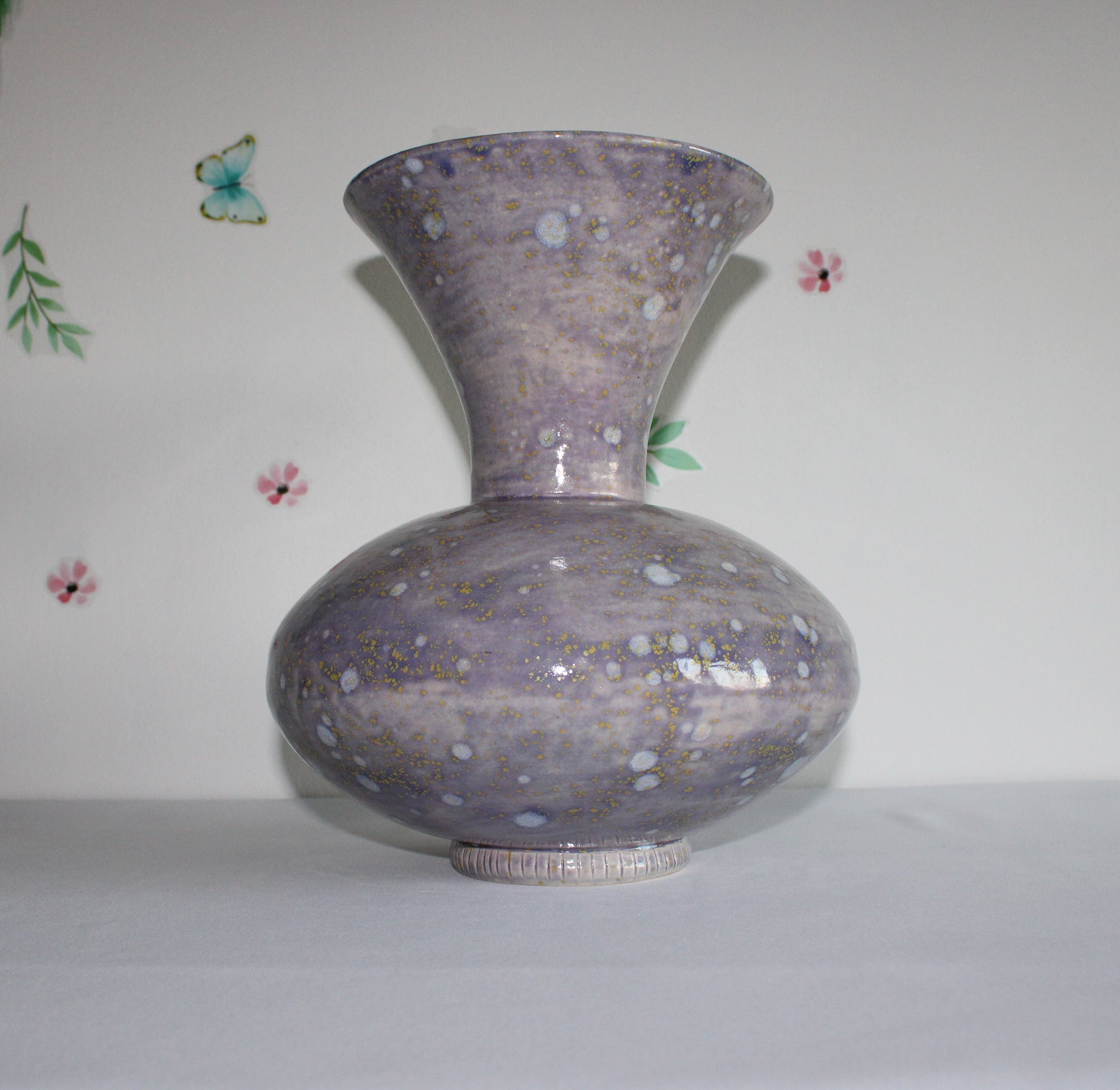 This handcrafted ceramic vessel features cosmic bloom patterns with yellow and white spots on a purple glaze. Its round form with a narrow neck and wide mouth makes it perfect as a vase for fresh or dried flowers, or as a decorative piece to add a touch of artistry to any space.