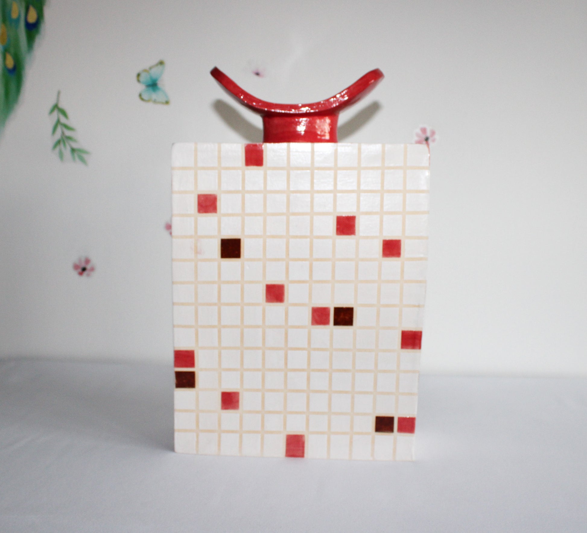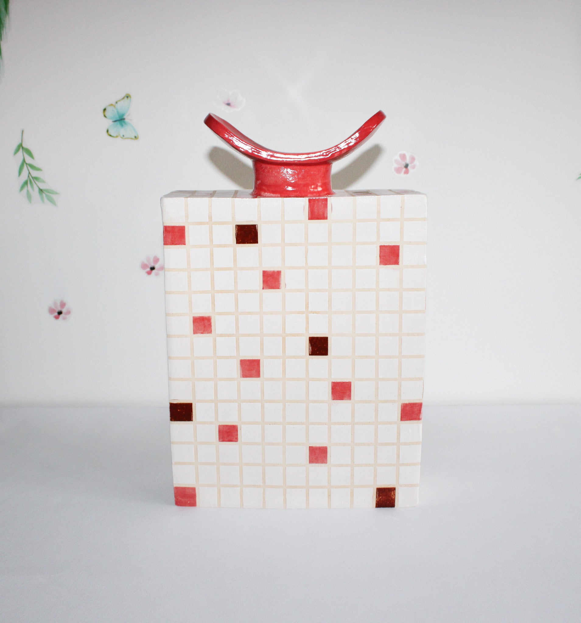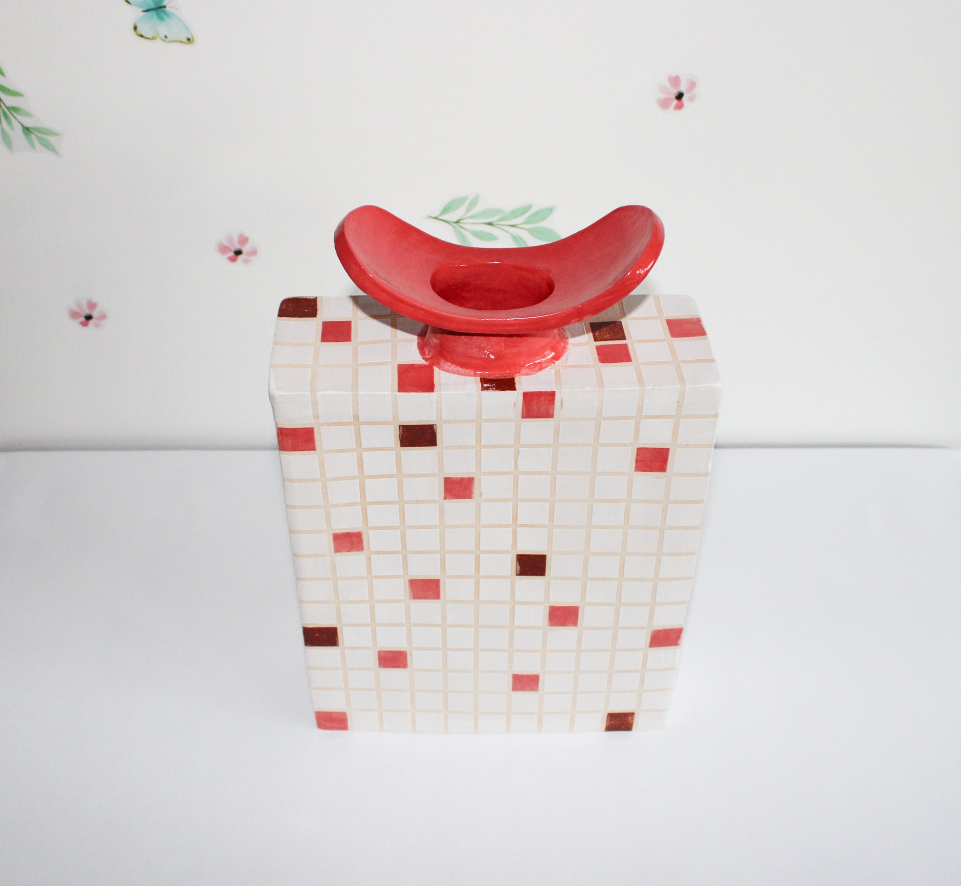 Clean lines, warm tones, and a hint of shine—this handcrafted ceramic vessel celebrates the quiet beauty of order and surprise. The soft grid pattern is accented with playful crimson and chocolate squares, while the sculptural top adds a daring flourish.