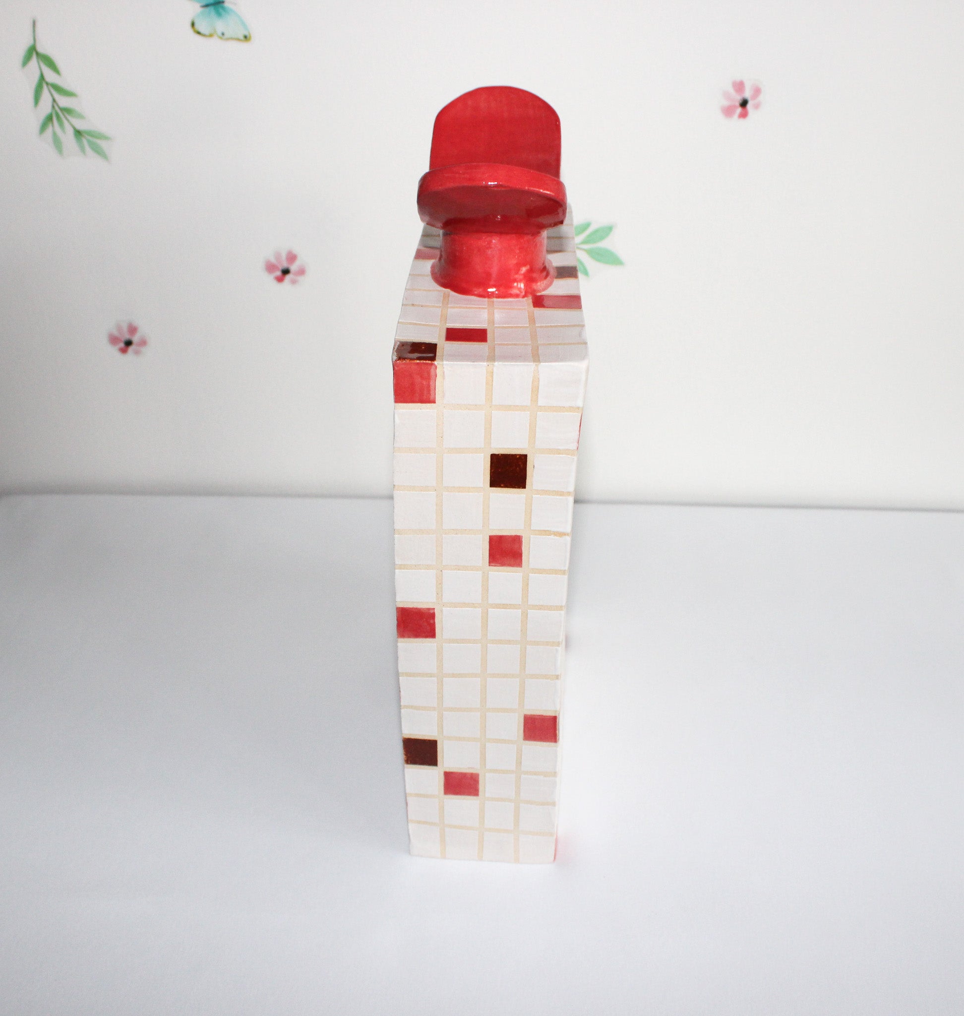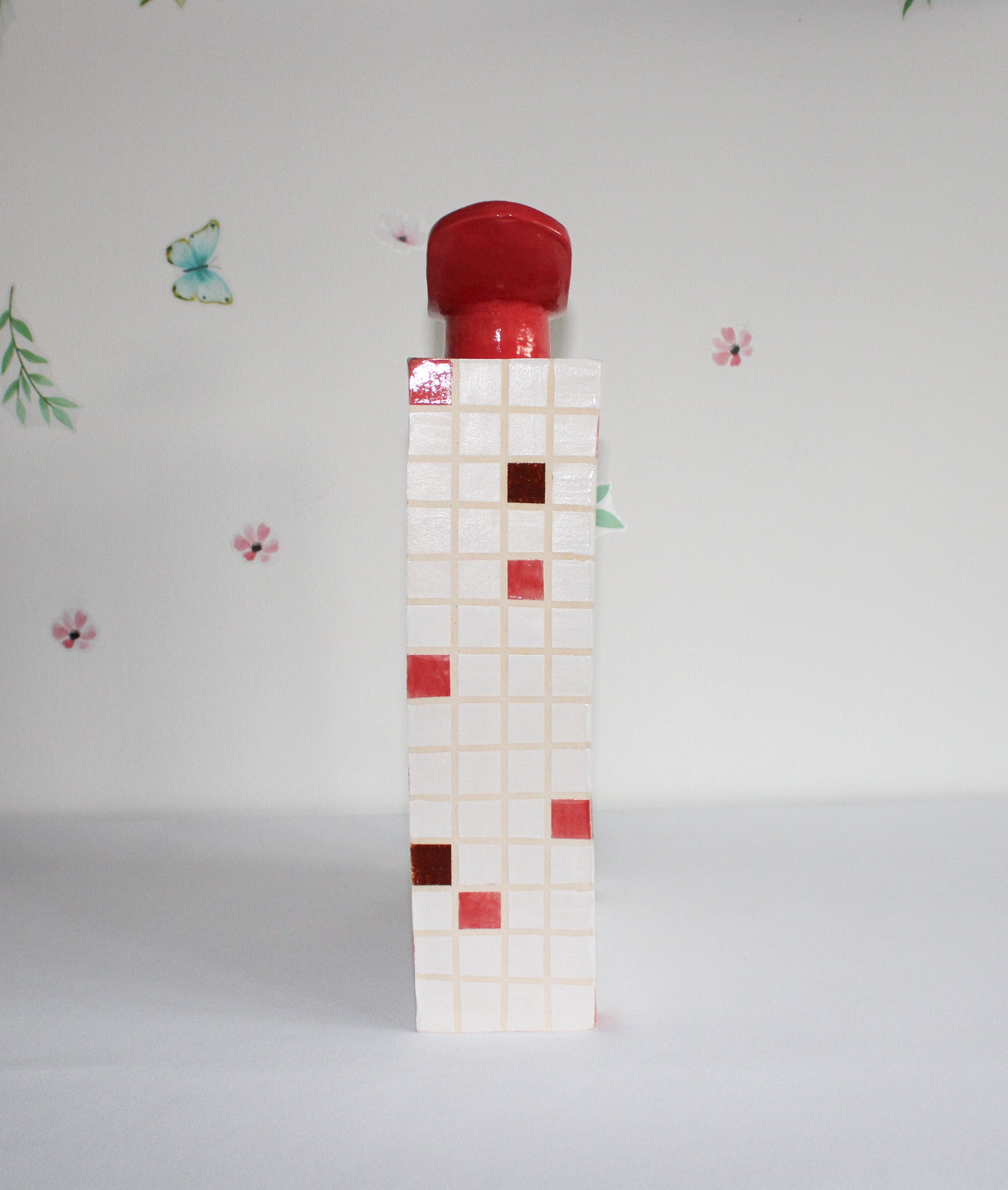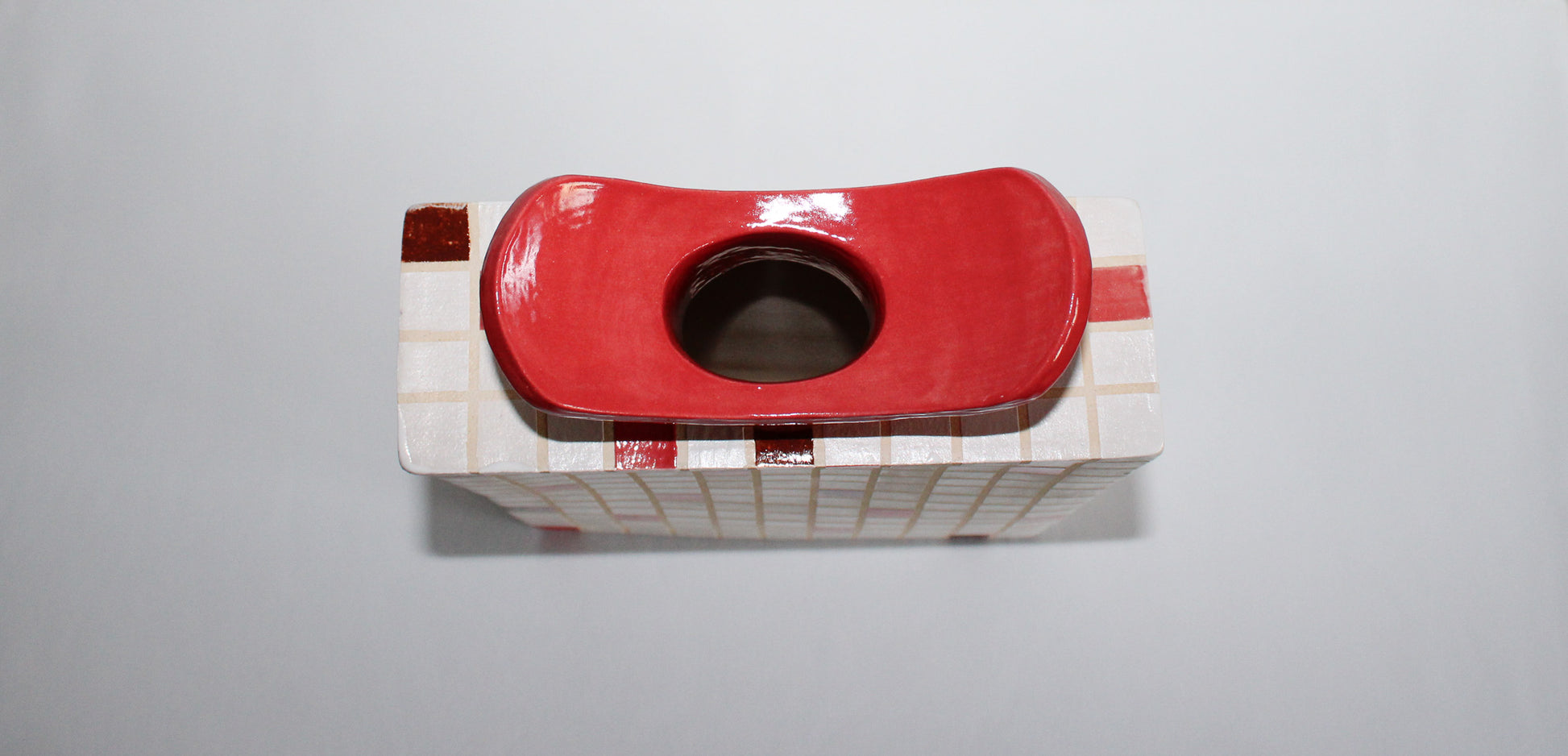 Clean lines, warm tones, and a hint of shine—this handcrafted ceramic vessel celebrates the quiet beauty of order and surprise. The soft grid pattern is accented with playful crimson and chocolate squares, while the sculptural top adds a daring flourish.