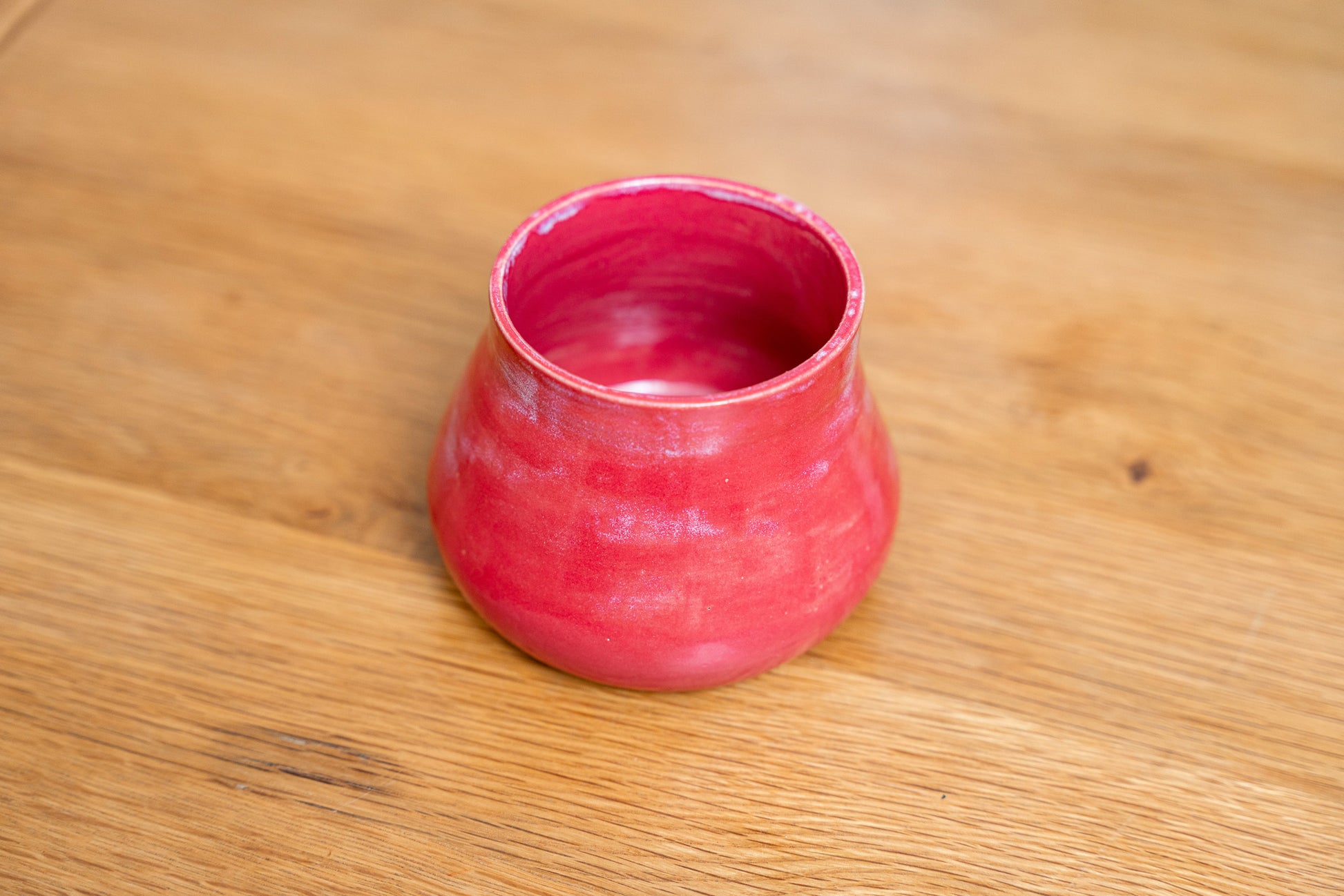 This medium-sized stoneware vessel features a mulberry glaze with white drips along the rim, creating a natural, flowing effect. Perfect for use as a small planter, vase, or decorative piece.