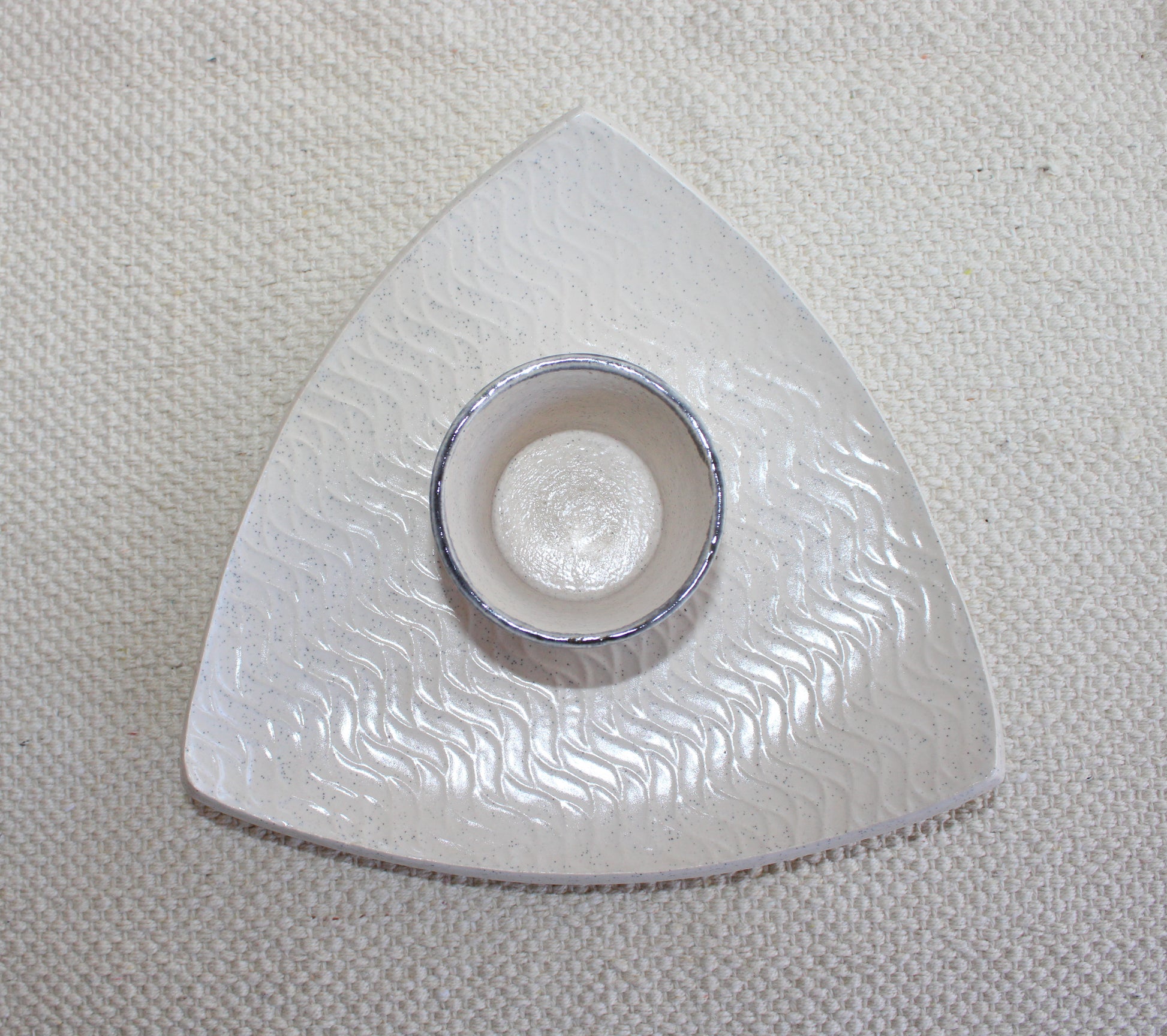 This handmade 2-piece ceramic set is perfect for serving chips and dip or snacks with sauces. The bowl and plate fit together beautifully, making it both functional and versatile.